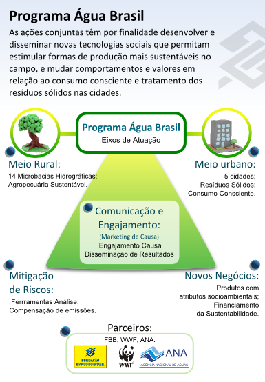 A Agência Nacional de Águas, o Banco do Brasil, a Fundação Banco do Brasil e oWWF- Brasil, percebendo grandes oportunidades em trabalhar conjuntamente para alavancar a sustentabilidade no país, formalizaram uma parceria de longo prazo.